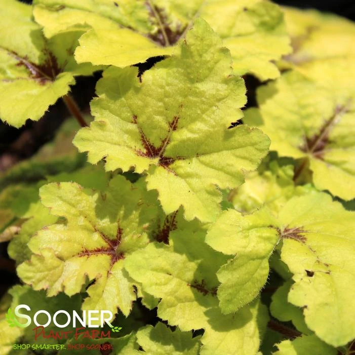 Buy Catching Fire Foamy Bells online. Vibrant, rounded, green leaves with cherry red markings form a tidy habit of foliage. In the summer, creamy spikes of flowers stand above the foliage and the red markings darken to mahogany. Best planted in an area with filtered sun or afternoon shade. Naturally more tolerant of heat and humidity than other heucherellas. Foliage is evergreen in most climates.