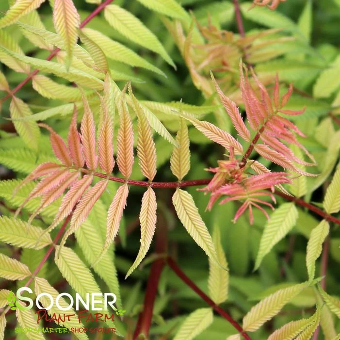 Buy Sem Sorbaria online. Sem Sorbaria is a very tropical looking shrub that works great in bed plantings. Its tricolor foliage gives a touch of the exotic to any location. It has a multi-stemmed, compact habit.
